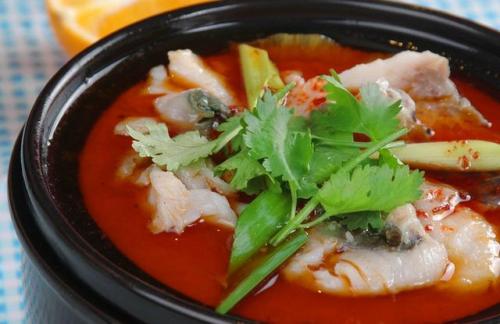 红油酸又名辣酸,红油酸以酸辣椒(糟辣椒)用油炒至见红油,再加入新鲜野生毛辣角炒香出色加汤熬制后去渣,调制而成。其味荤厚而酸辣醇厚,色鲜红