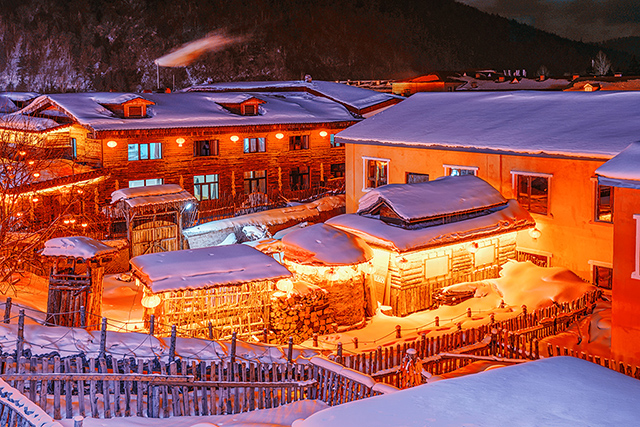 由于东北的纬度高,冬季昼短夜长,早上8点天亮,下午4点就天黑了,白昼有八个小时,游玩时间是充足的。可能对于习惯了晚上十一、二点才睡觉的都市人,会担心这里的夜晚会不会很无聊,但其实雪乡夜晚也特别热闹,有各式各样的摆摊,像有糖葫芦、冻柿子、冻梨、车厘子、雷锋帽等等,大家还可以沿着“中国雪乡”的石碑后面的栈道上去,这里是雪乡极佳的观景台,在这里可以眺望整个雪乡,家家户户点上了灯笼,在灯光衬托下,十分梦幻,仿佛来到童话世界一般。